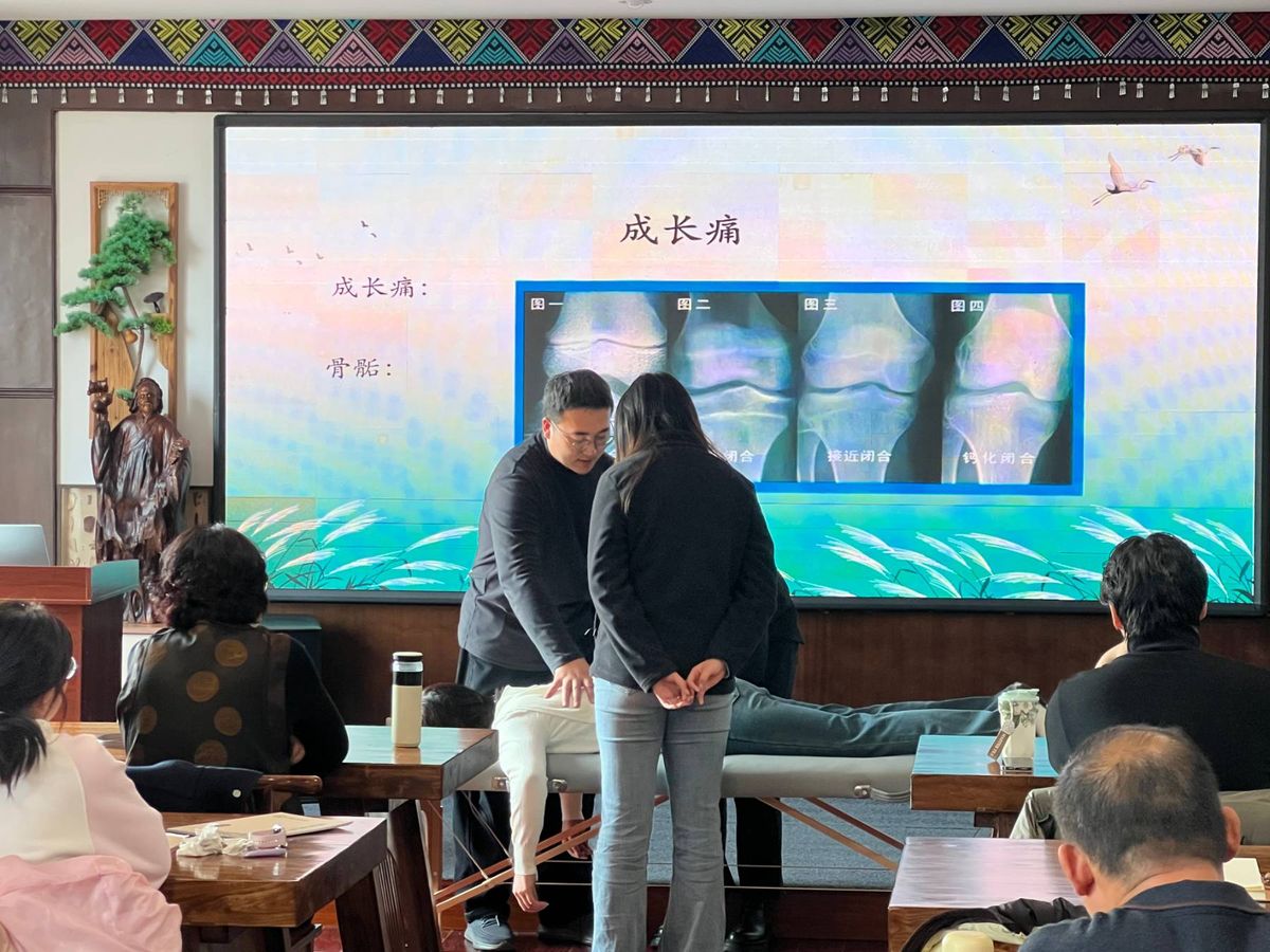 课堂上,老师重点讲解了腰腿部核心穴位的精准定位与点按技巧,以及紧张肌肉的科学松解方法——详细演示了肾俞、命门、环跳、委中、足三里等关键穴位的取穴诀窍,手把手指导学员把控发力力度与角度,传授瑶医特色“点揉结合法”:拇指按压主穴,其余四指辅助固定,力度由轻至重,以酸胀感渗透经络为宜,配合缓慢揉动,既能疏通经络、缓解疼痛,又能松解肌肉粘连、改善局部循环。针对腰椎劳损、膝关节不适等不同症状,老师还定制了专属调理方案,让学员能精准应对各类腰腿部问题。