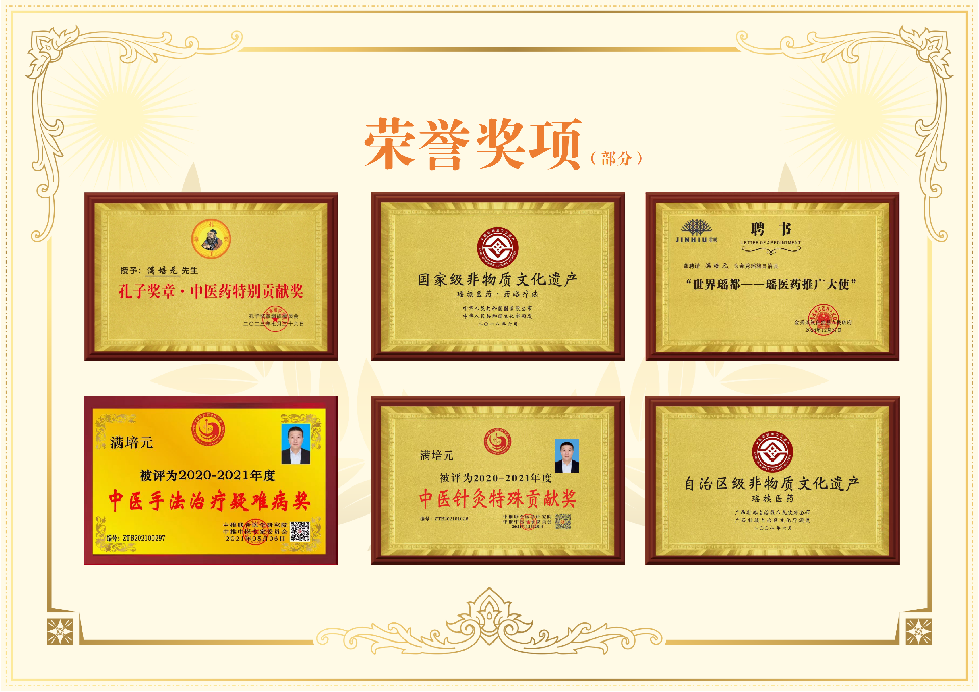 满培元先生在瑶医药与中医领域成果丰硕,收获多项权威认可: