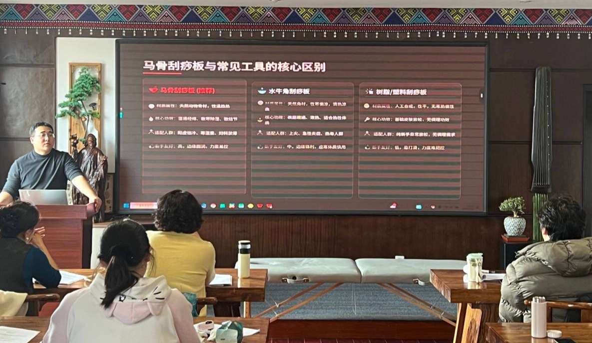 王杰老师首先为大家追溯了马骨刮痧的历史渊源与文化价值,随后系统讲解了标准化操作规范:从马骨刮板的选材与清洁,到瑶药精油的搭配使用,再到刮痧的力度、方向、时长,每一个环节都细致入微。